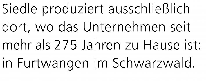 „SSS“ kommt nur im Siedle-Markenzeichen vor. In normalem Text wird „Siedle“ geschrieben. Beispiel: Siedle produziert ausschließlich dort, wo das Unternehmen seit mehr als 275 Jahren zuhause ist: in Furtwangen im Schwarzwald.