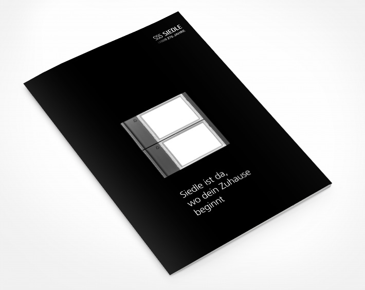 Egal ob es um den Bestellkatalog geht, Produktbroschüren oder andere Info-Materialien: Eine wiedererkennbare Designsprache prägt alle Siedle-Medien. Die Gestaltung setzt auf Reduktion, großzügige Leerräume und flächige Symmetrien.